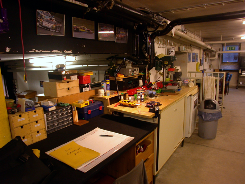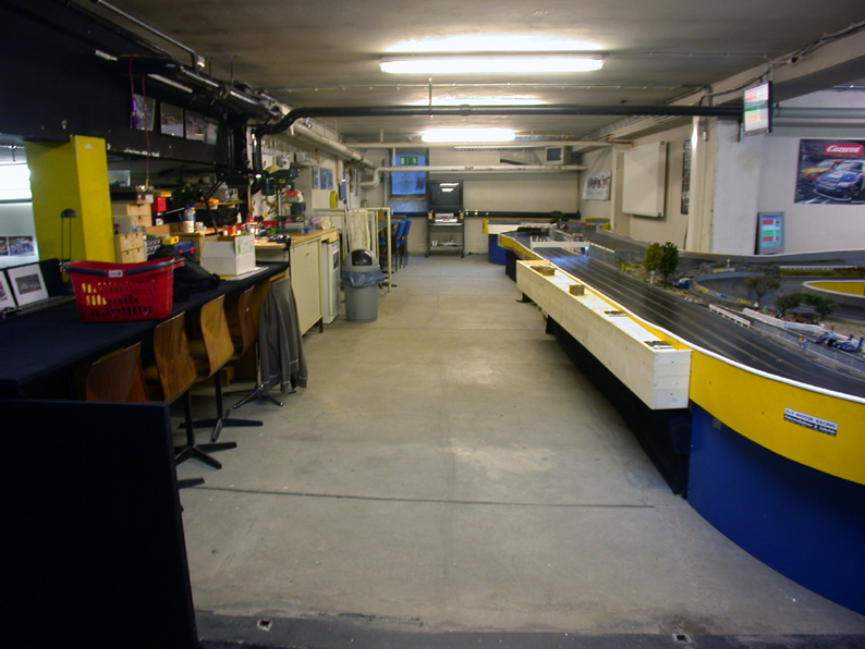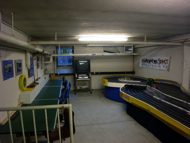 Wir haben einen eingerichtete Kellerraum mit Werkstatt, einer Carrera- und einer Concept-Holzbahn und